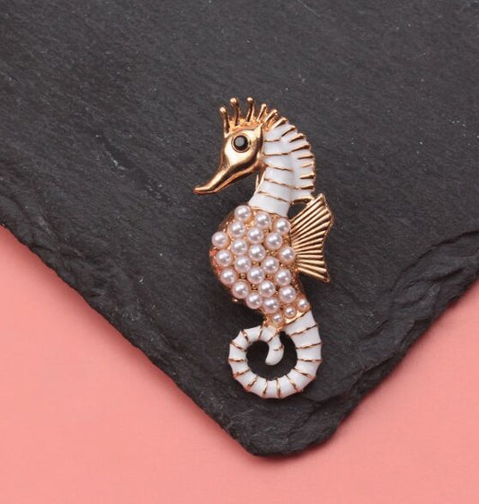 Elegant Pearl Seahorse Brooch with Rose Gold Finish & Enamel Detail