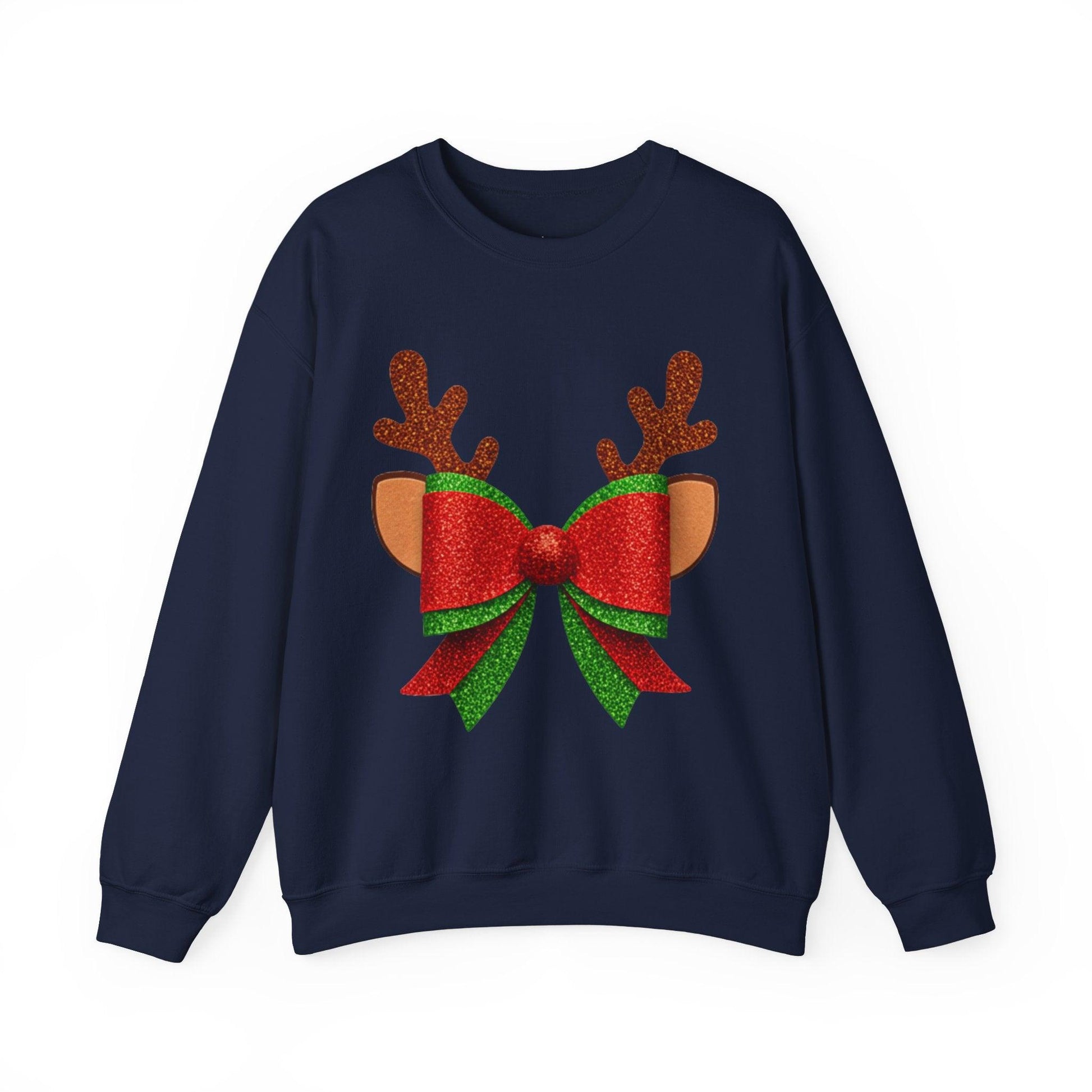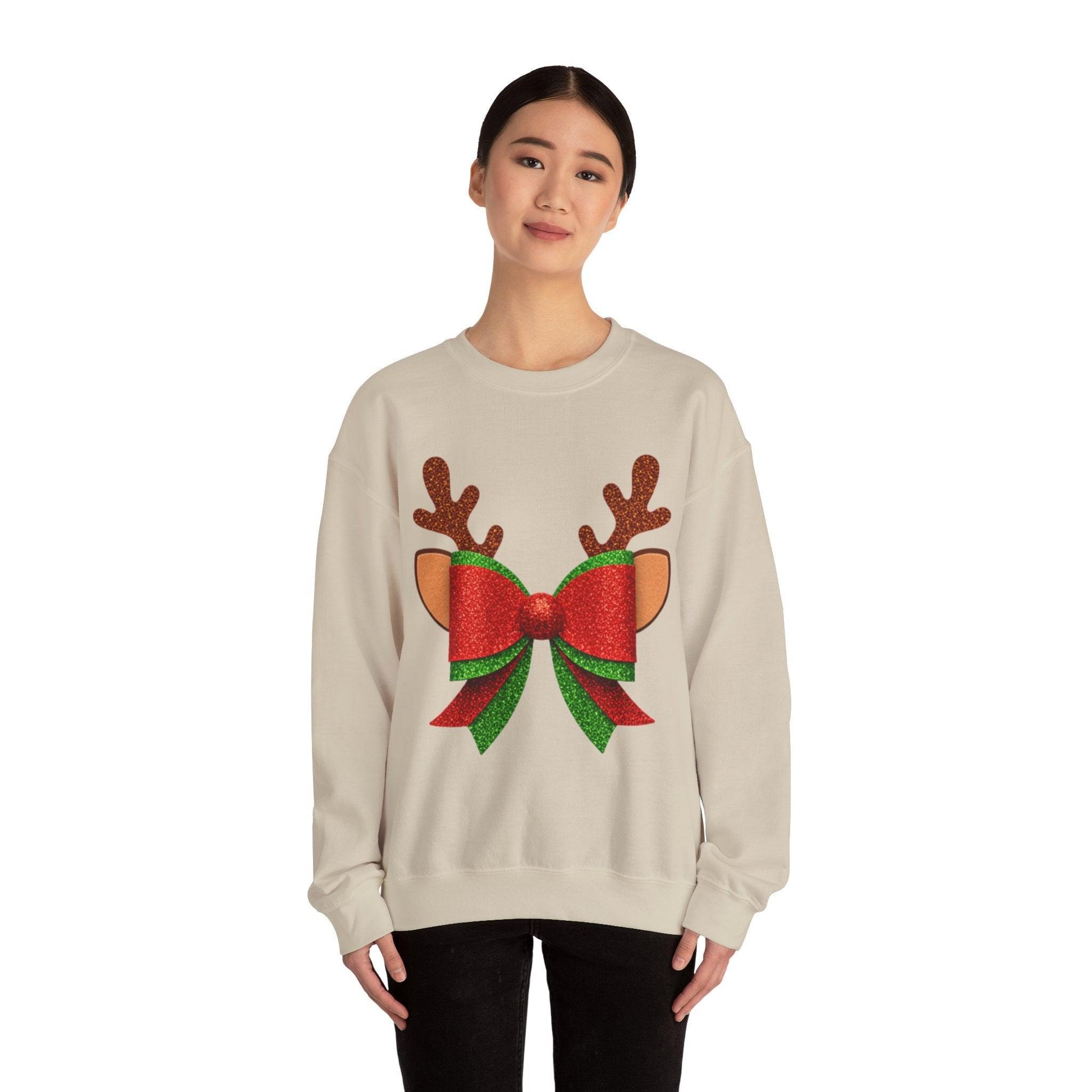 A cosy and festive Christmas-themed sweatshirt featuring a Christmas bow with antlers and a red glitter nose printed on it. Perfect for adding some holiday cheer to your wardrobe and staying warm during the colder months. Ideal for anyone looking to embrace the holiday spirit with a touch of fun.